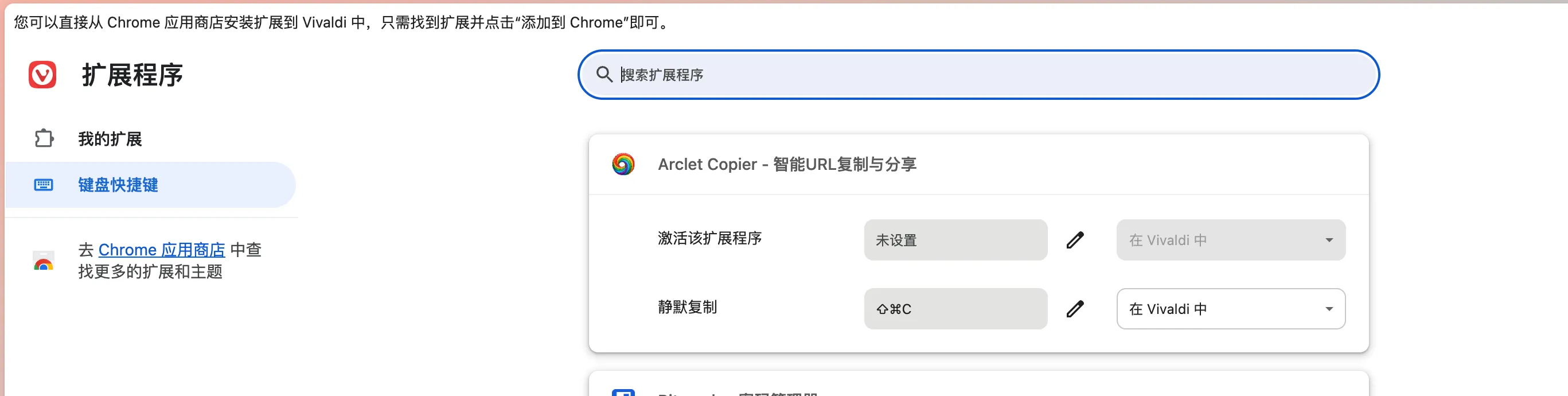 注意复制Tab链接的功能需要在「扩展程序-键盘快捷键」中设置: