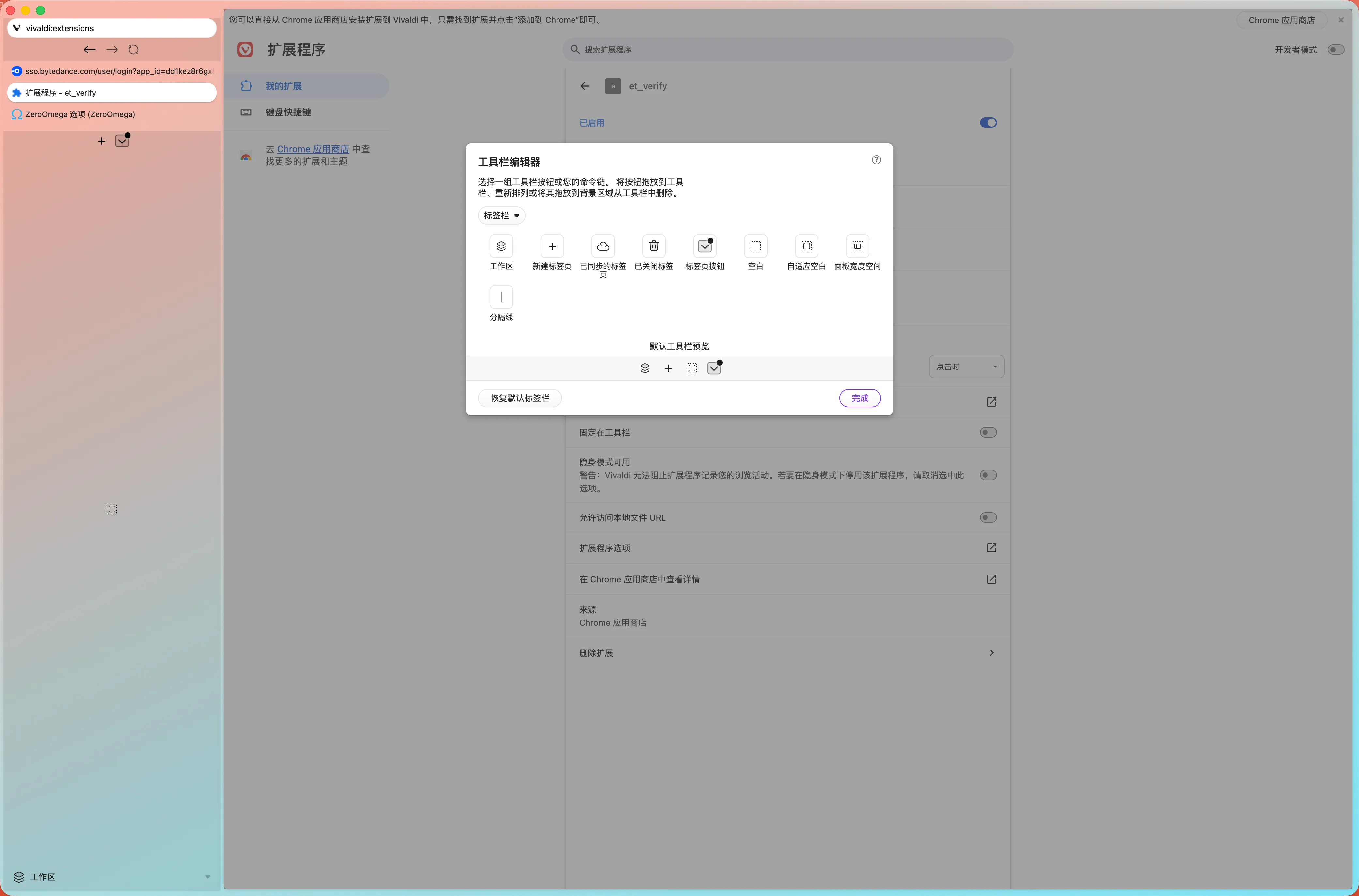 基于上面梳理出的Feature,我们基于Vivaldi浏览器使用配置+拓展的方式挨个进行还原,最终效果如下: