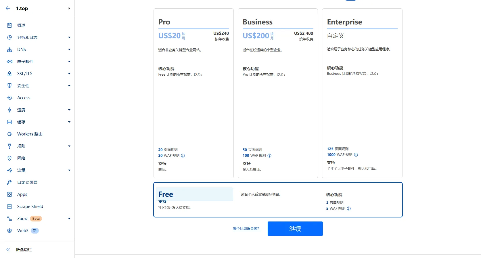 - 创建Cloudfare账号,点击创建网站,输入你的域名,选择服务套餐