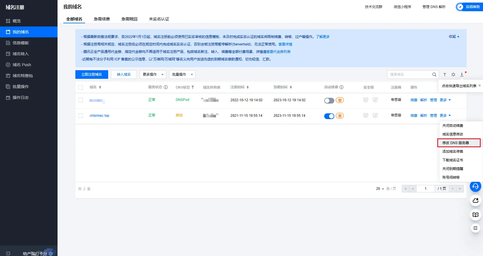 - 在你的域名注册机构→域名管理处更改DNS提供商为Cloudfare提供的两个链接,这里以腾讯云为例