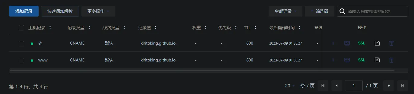 - 在域名提供商处添加或修改DNS解析,我的是DNSPod,如下图所示