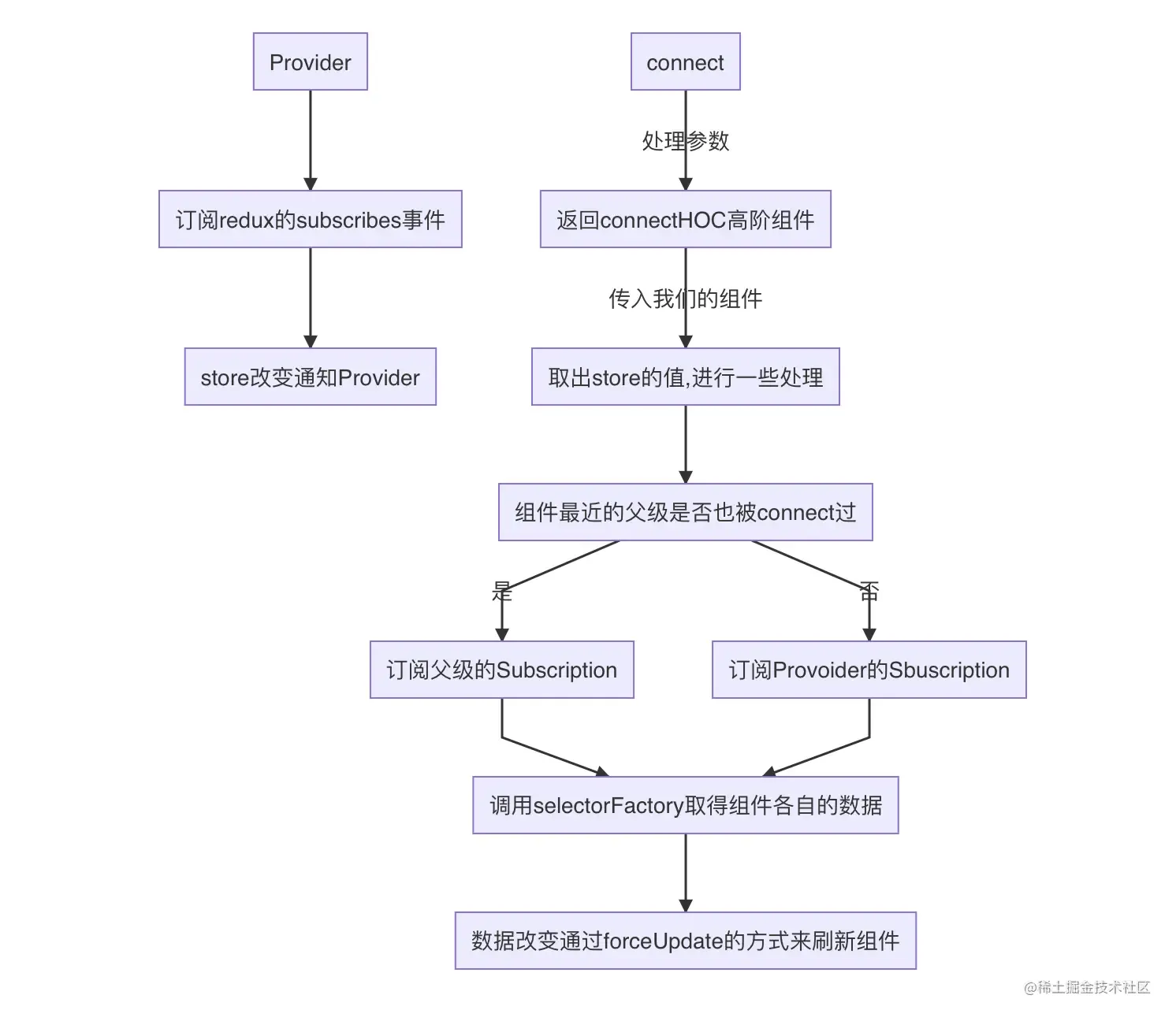 Provider组件的Context时会自动生成一个Subscription实例,它包含了我们的store,并使用redux store的subscribe(callback)订阅了最顶层的消息,即在整个store发生更新时得到通知,其逻辑和其他层级的subscribe是一致的 - 在使用