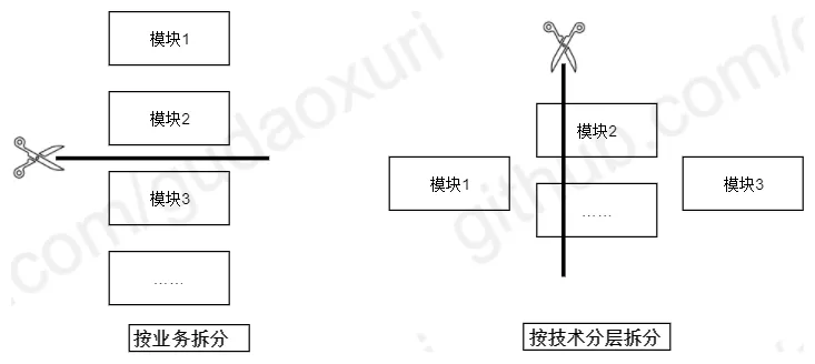 - 业务拆分:按照业务对模块进行拆分,但模块之间如何相联就成了下一个问题(如果分开开发,一起部署就仍是单体架构;如果分开部署到Web上,则成了后文提到的SOA架构)
