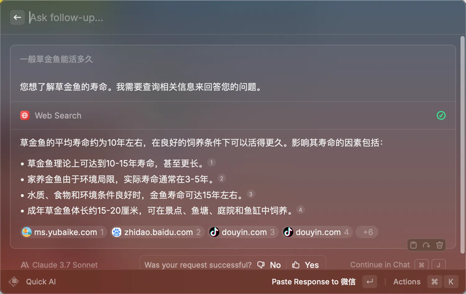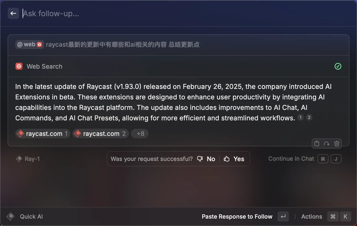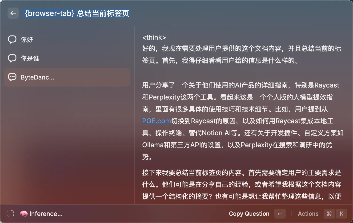 Raycast现在是我的主力模型平台,它承载了日常交流中80%以上的对话和咨询,包括模型对话、联网查找等。