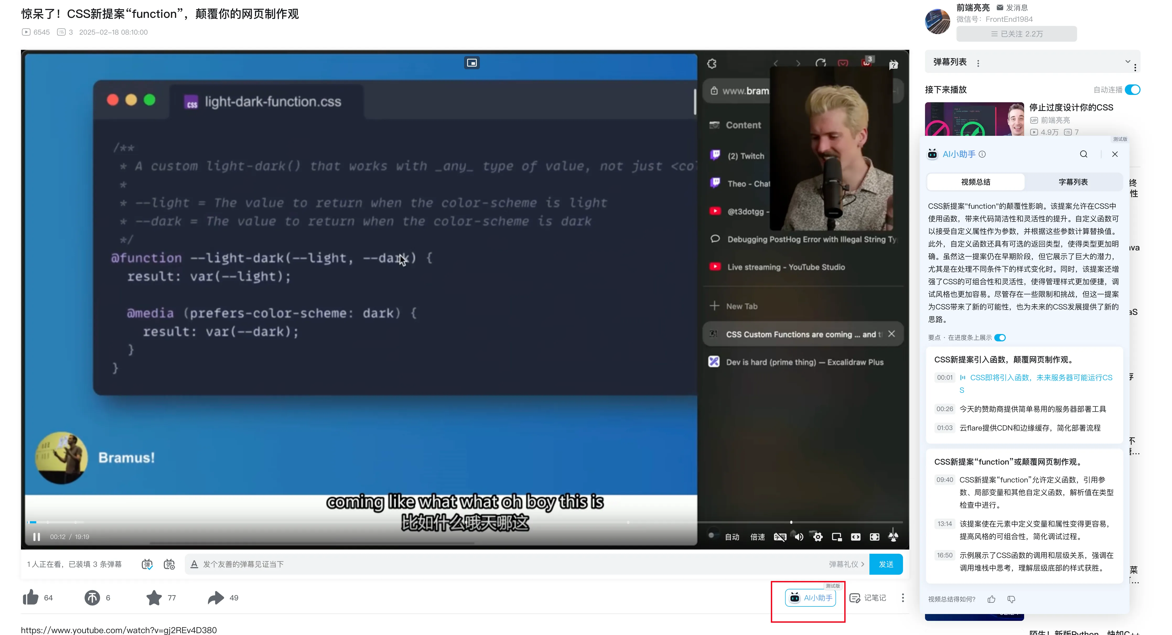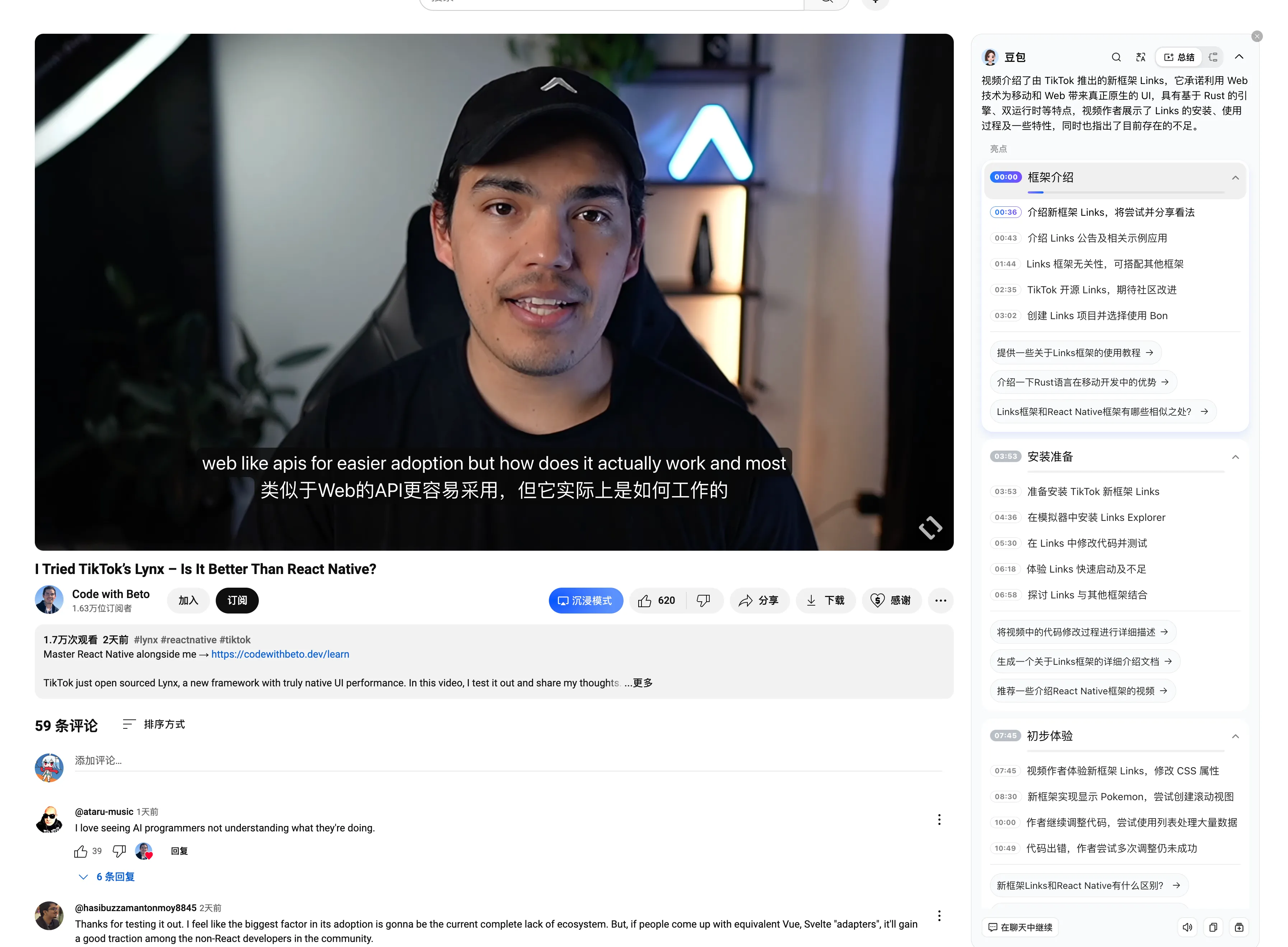 基于字幕快速帮你看完整个视频并生成总结,可以快速跳转到感兴趣的部分,并在聊天中询问视频内容,目前已不支持bilibili,但可以使用内置的「视频小助手」替代