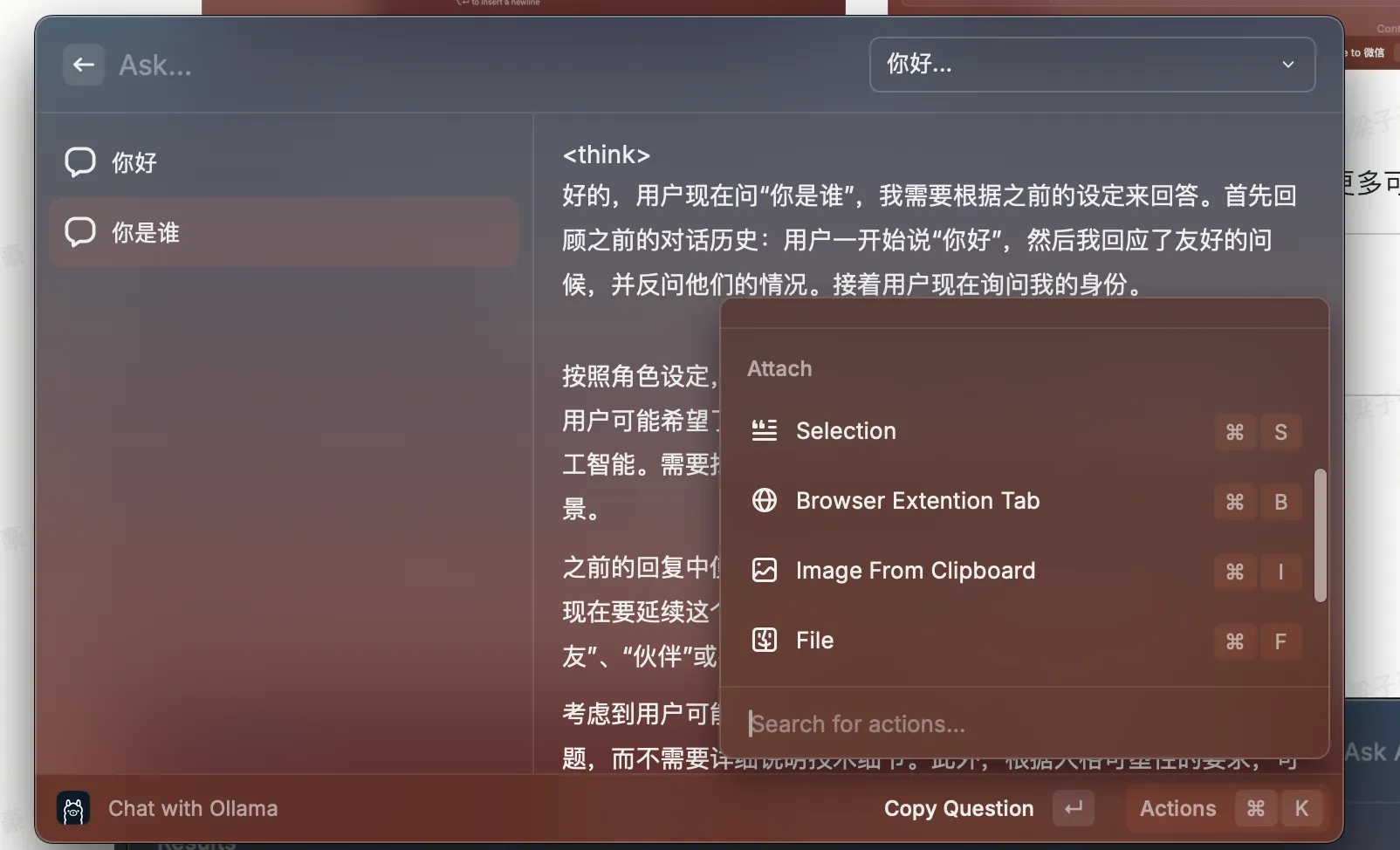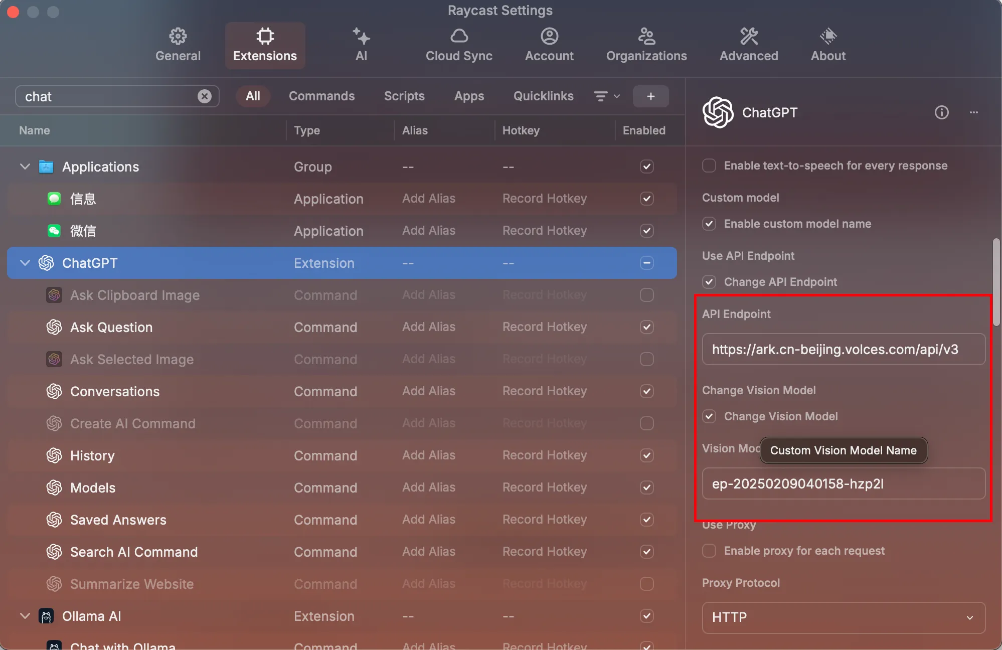Raycast Store中的Ollama和ChatGPT插件,更方便地调用API进行聊天,通过一些配置也可以还原大部分的Raycast AI功能,且完全不用额外付费。