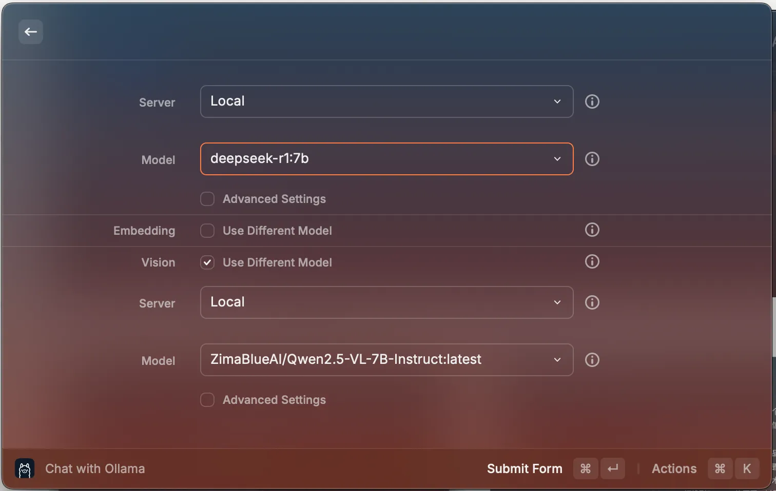 同时,Raycast还支持针对不同场景配置不同的模型,这对不支持多模态的推理模型非常实用,比如我的日用搭配就是Qwen2.5-VL+DSR1-7b,跑在36G+M3Pro上还是比较流畅的。