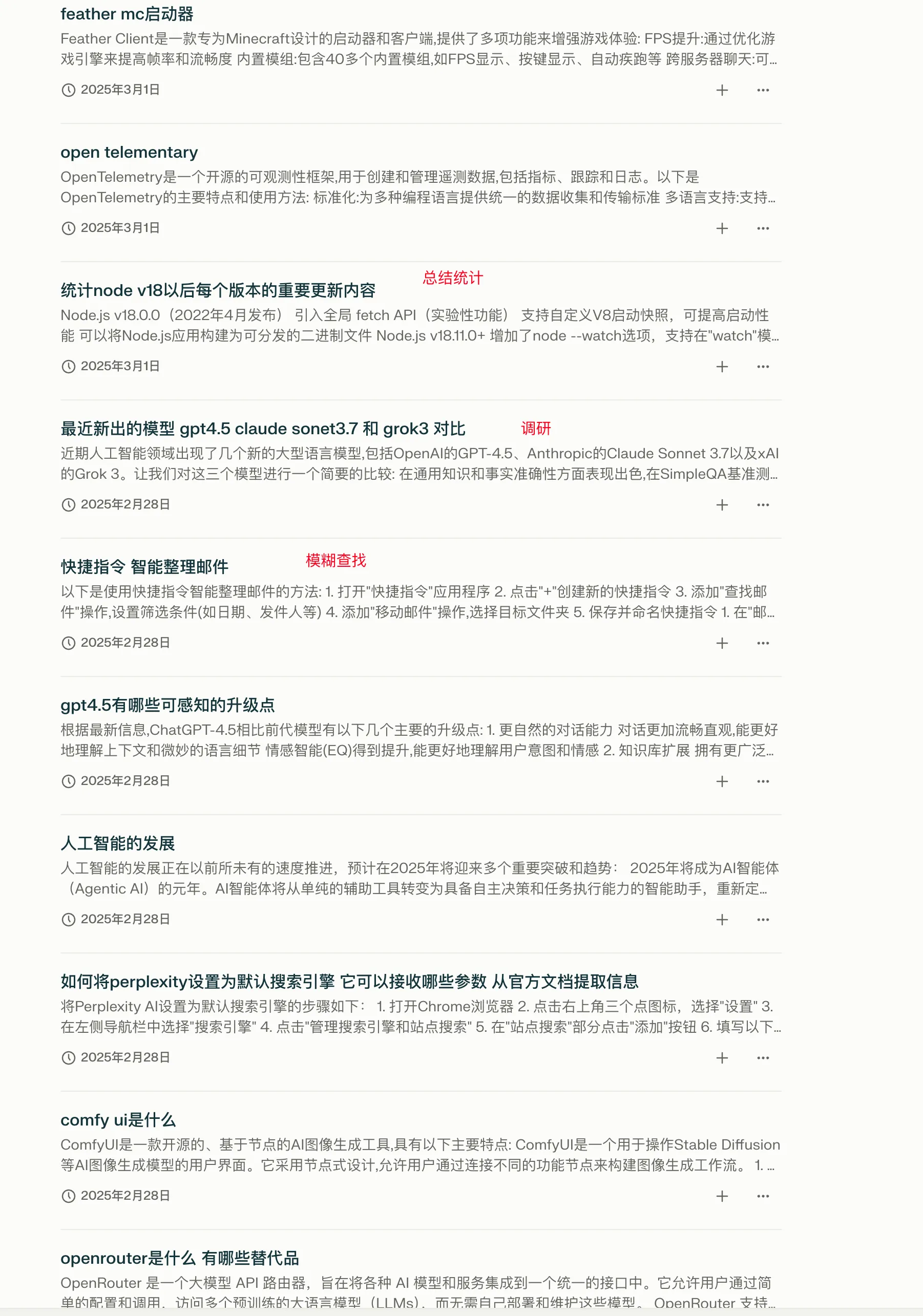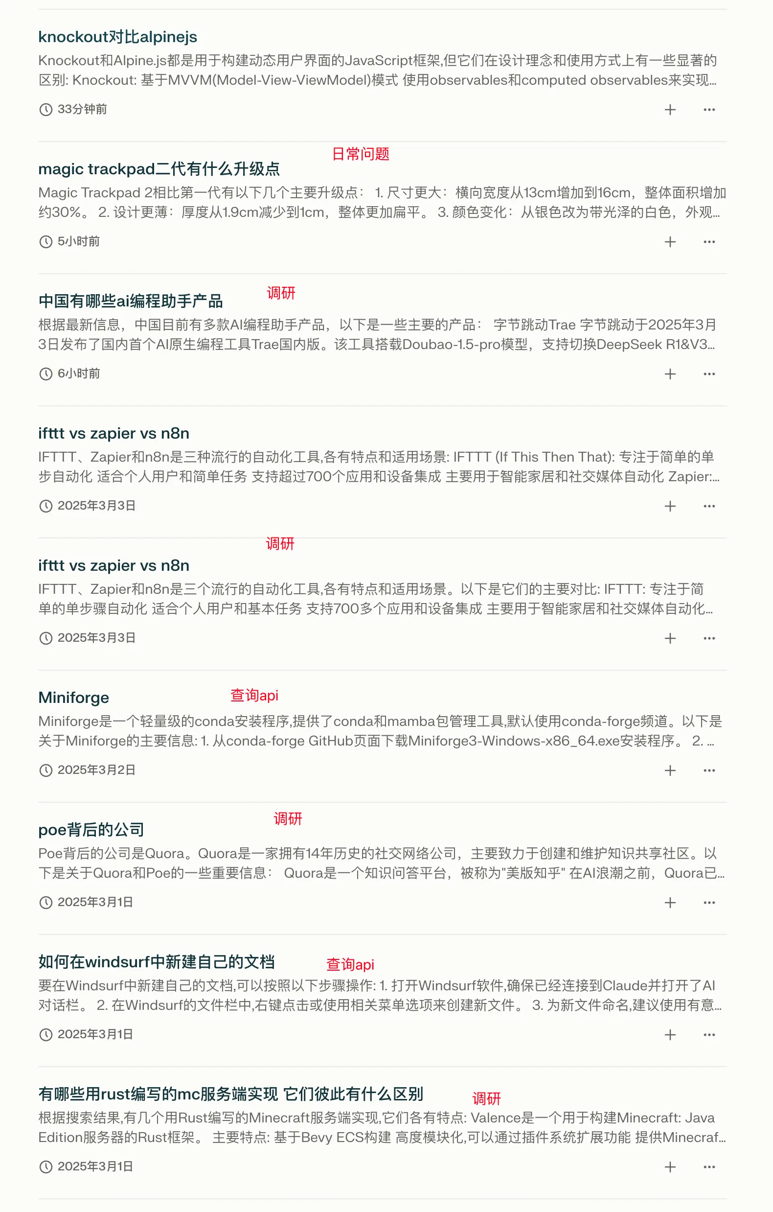 下面是我近期使用Perplexity的查找记录,基本都是传统搜索难以覆盖或者工作量很大的领域,PPL为了节省了大量的时间,而其他的搜索工具都太简陋了,PPL这种专门的AI搜索工具像是有一个人在帮我查资料做总结,而其他工具则像是提供了一个「顺手查查资料」的途径。(移动端豆包做的还是很不错,但是专业搜索感觉还是差点意思)
