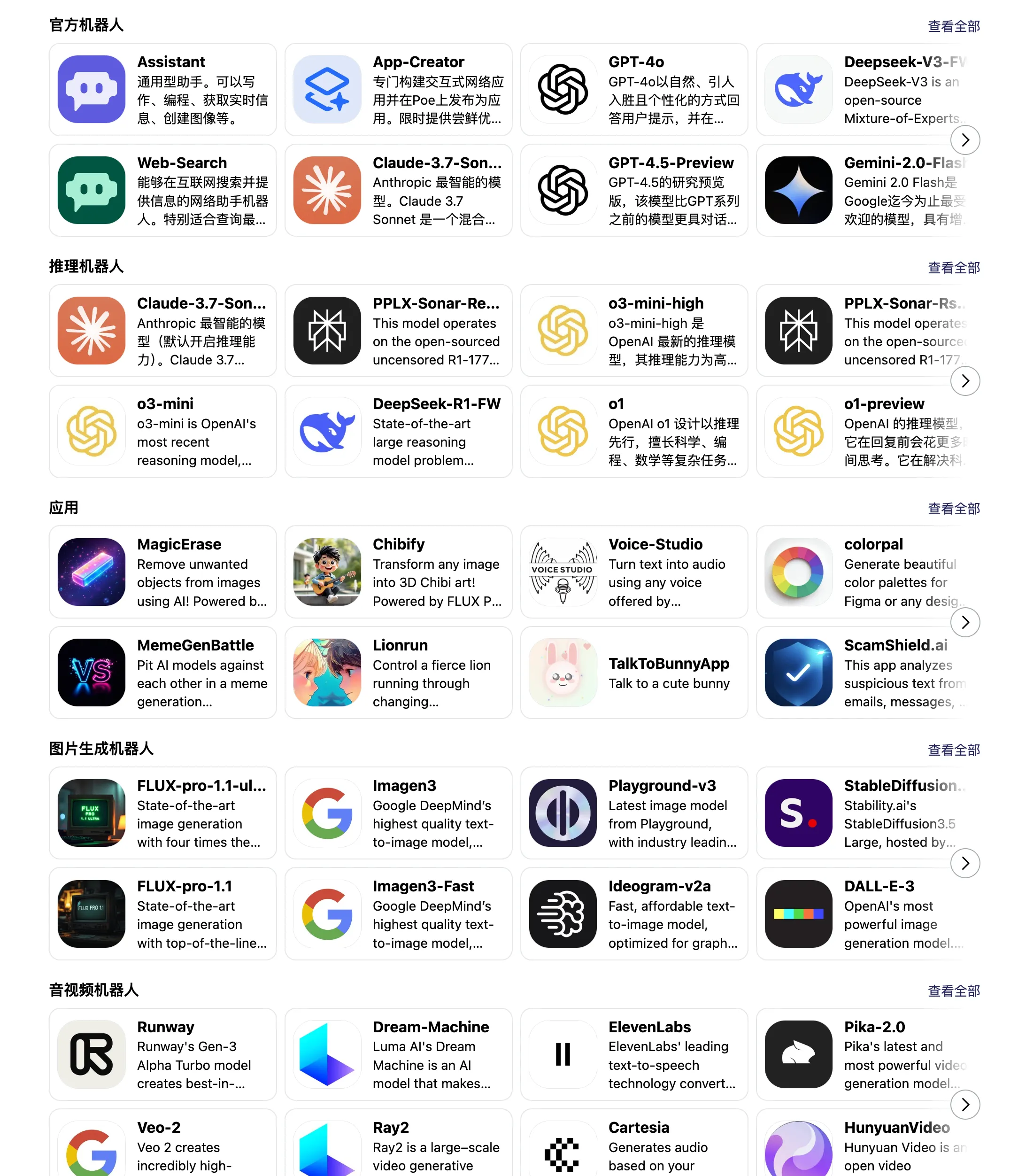 在这之前,我的主力模型平台是POE,它的优点是用和GPT/Claude一样的价格($20),可以一站式地体验到所有的模型,包括主流语言模型、推理模型、图像生成模型、音视频生成模型等。