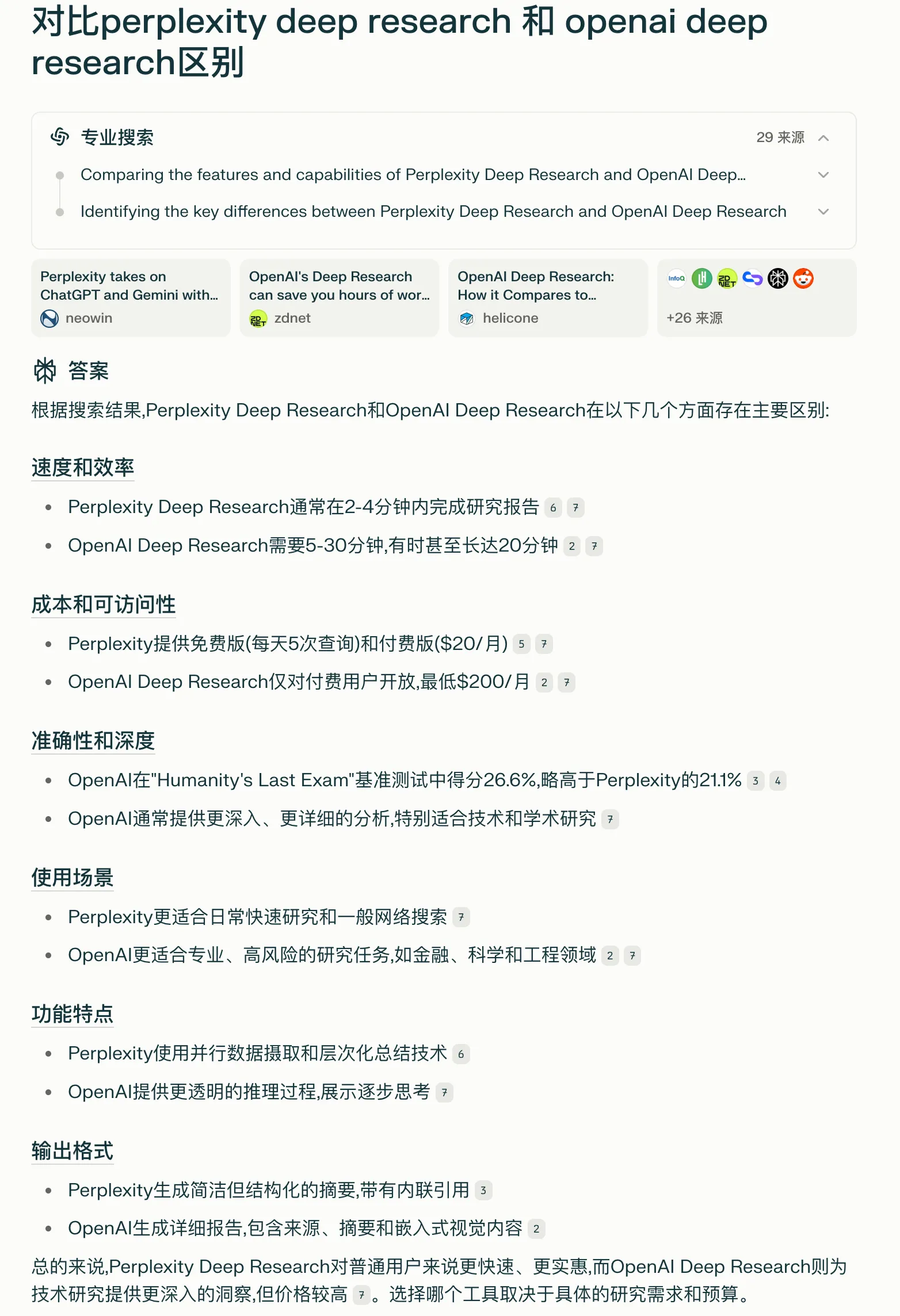 - DeepResearch目前看来是Pro搜索的增强版,搜索时间比较长,但效果并没有好很多,因此目前看来实用性是比较低的