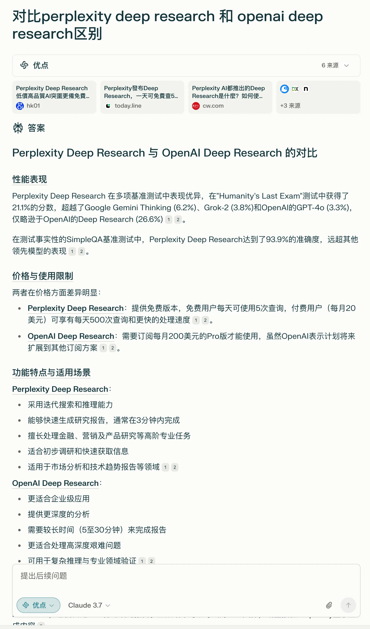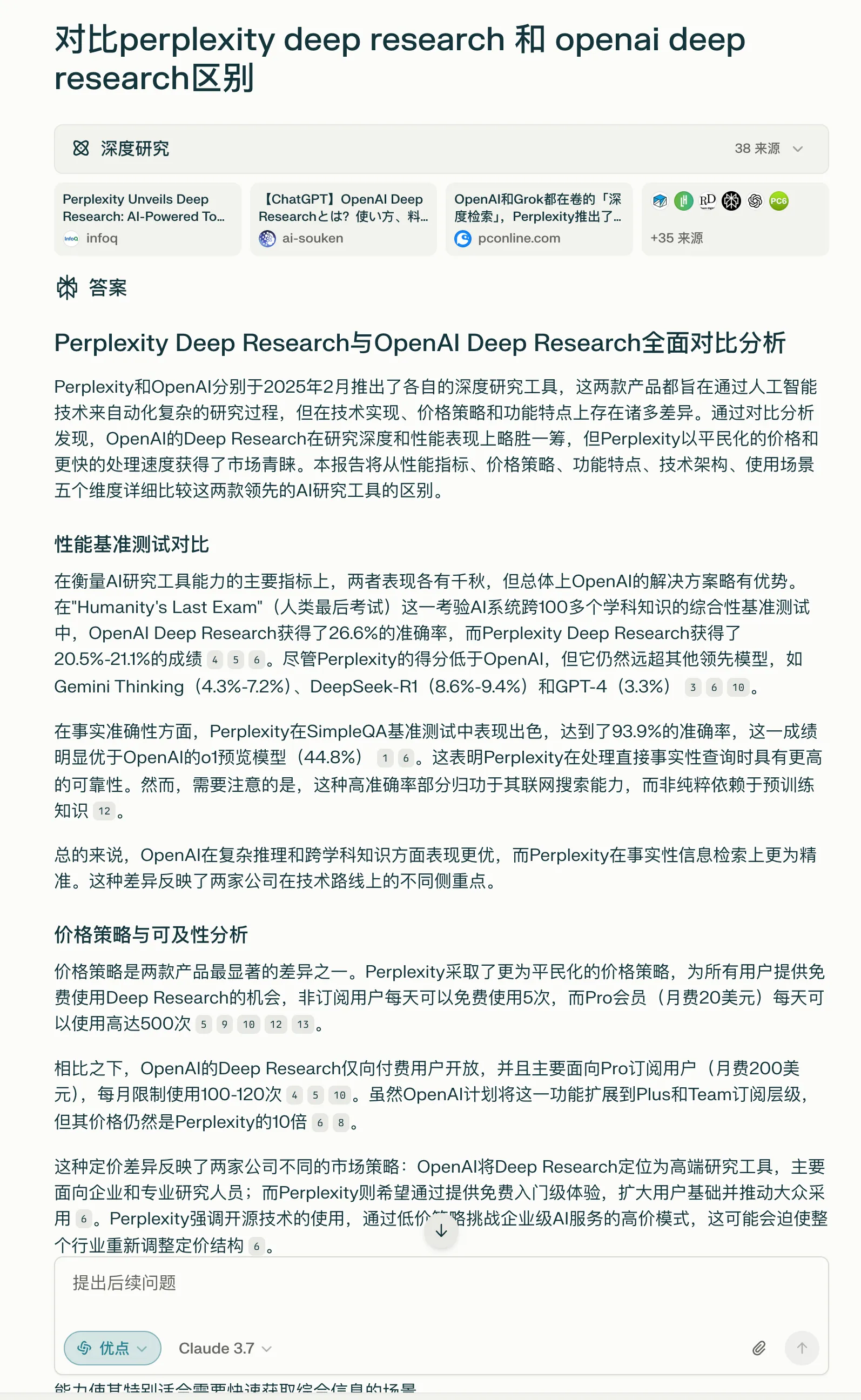 那么,Perplexity的Deep Research和OpenAI的有什么区别呢?这里说说我的看法。