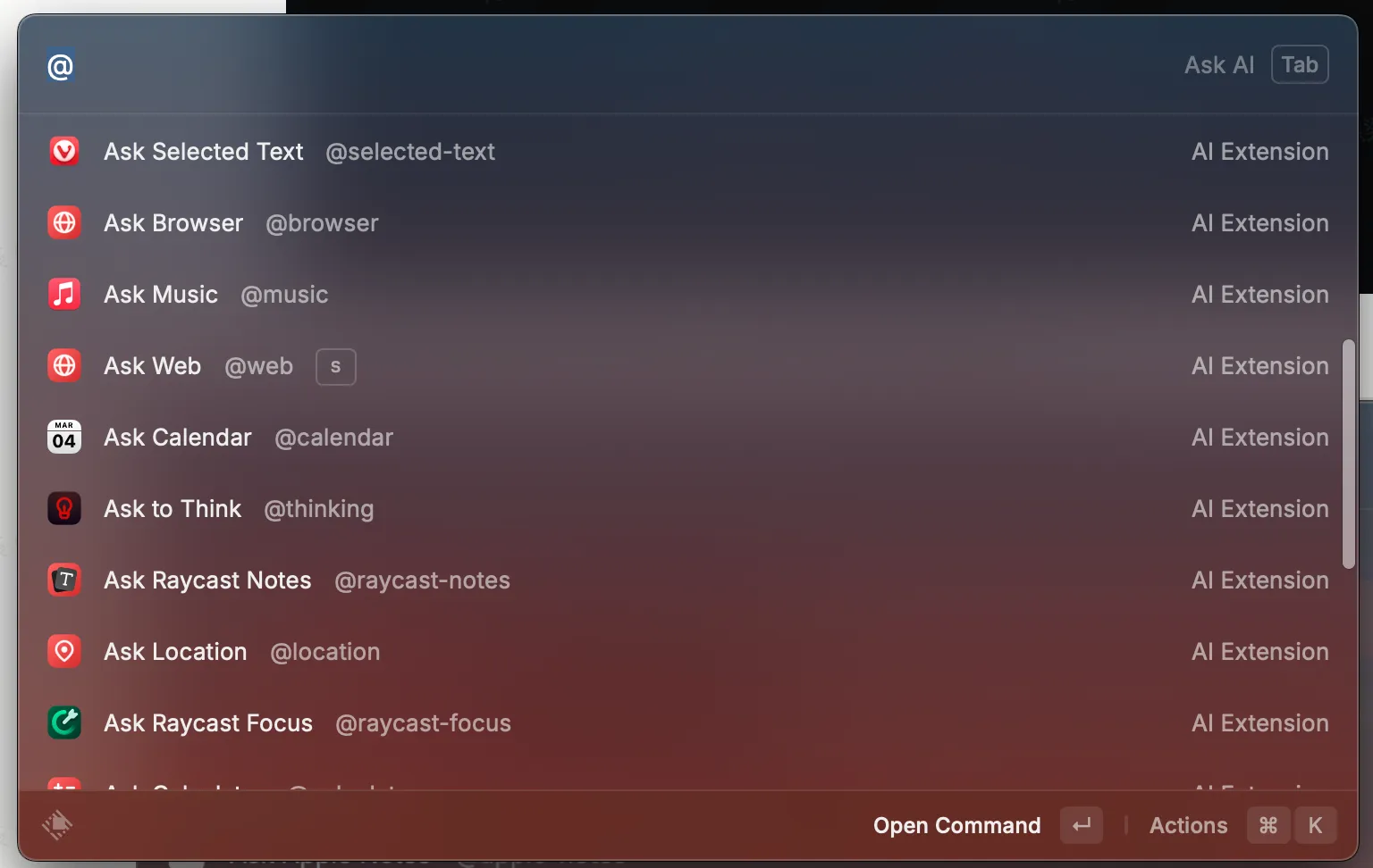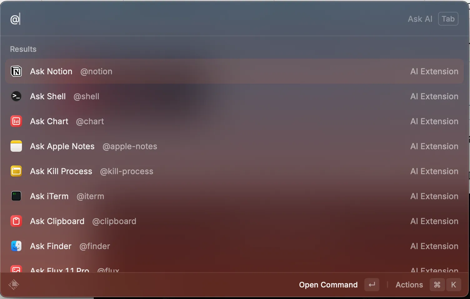 正值此时,Raycast带来了一个重磅更新:将整个电脑的能力都暴露给大模型,让Raycast成为了一个大Agent。