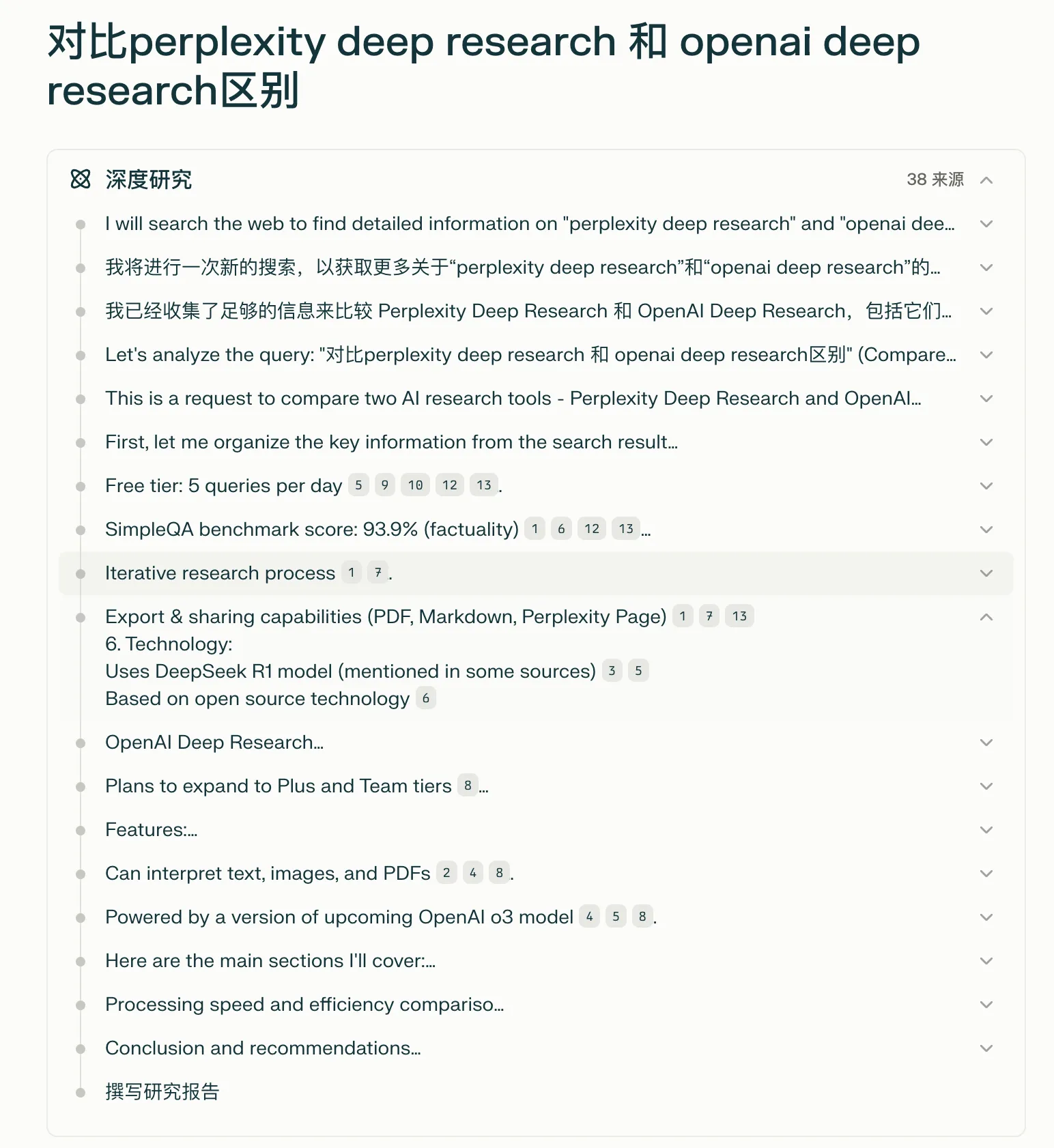 - 而Perplexity的思考过程更像是针对「分解搜索任务」特调的R1推理过程,基本只能使用搜索工具,更像是Pro搜索的升级版而不是研究Agent,比较简陋,一般3分钟内就可以完成