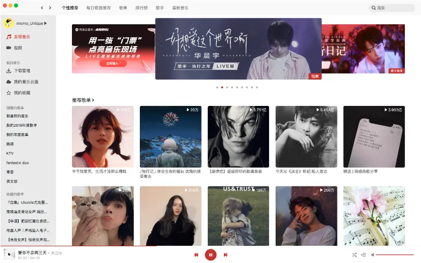 但是我们最终却需要用React实现一个全功能的网易云播放器 (2024-01-29悲报:造福一方的网易云开源API被网易告然后Archive了),就像下面这样: