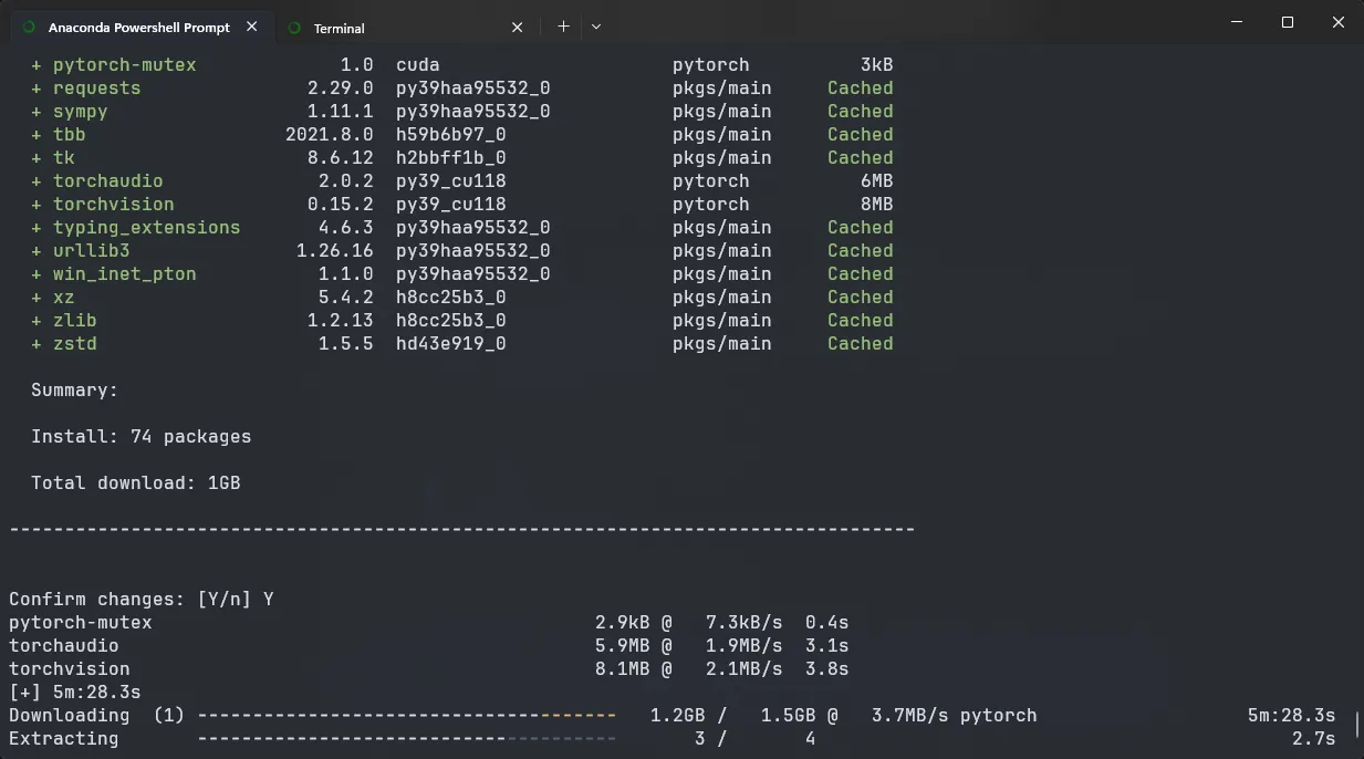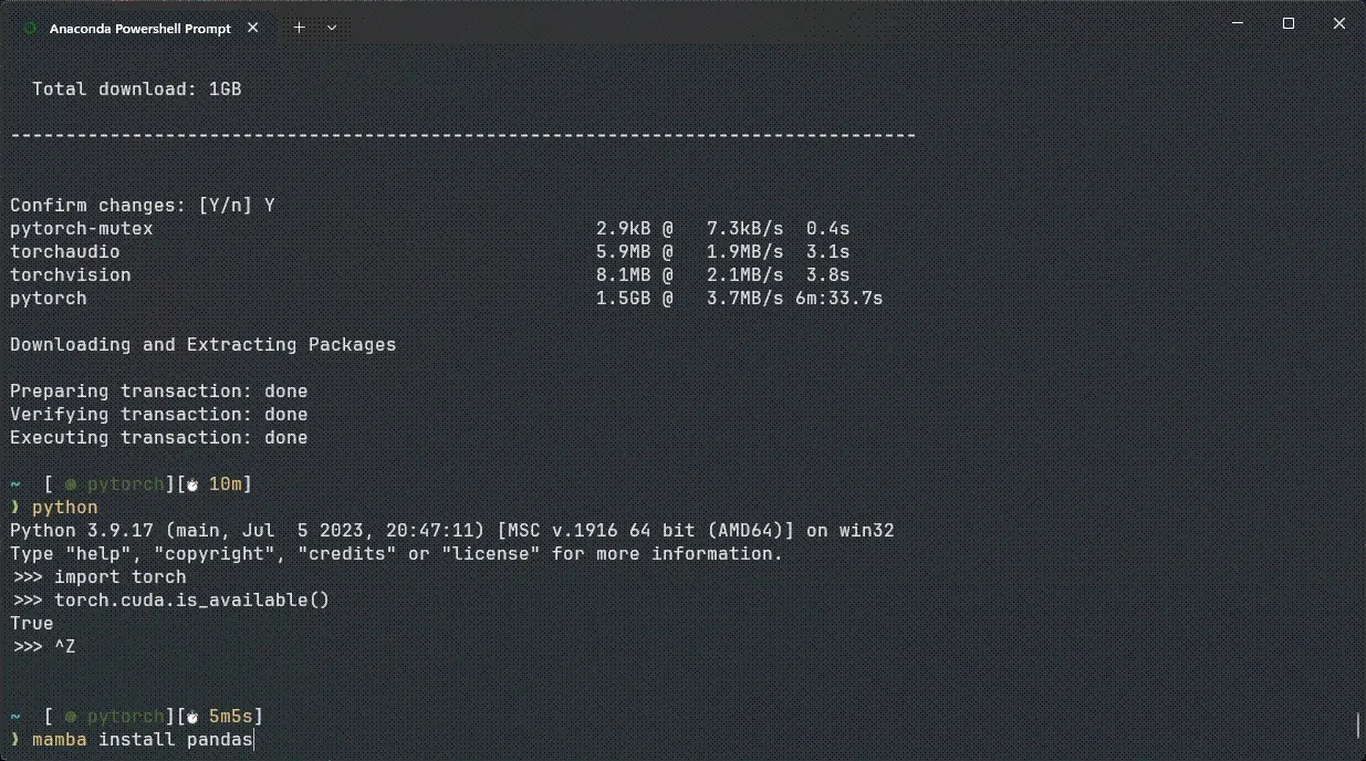 $ mamba install pytorch torchvision torchaudio pytorch-cuda=11.8 -c pytorch -c nvidia由于我之前安装好了cuda11.8和对应的cudnn,这里直接展示结果(也可以看到mamba全新安装pytorch居然只用了10分钟):