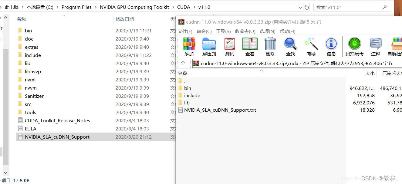 - 根据Toolkit版本去官网下载安装cudnn,压缩包解压后放进Cuda Toolkit安装目录的对应文件夹里